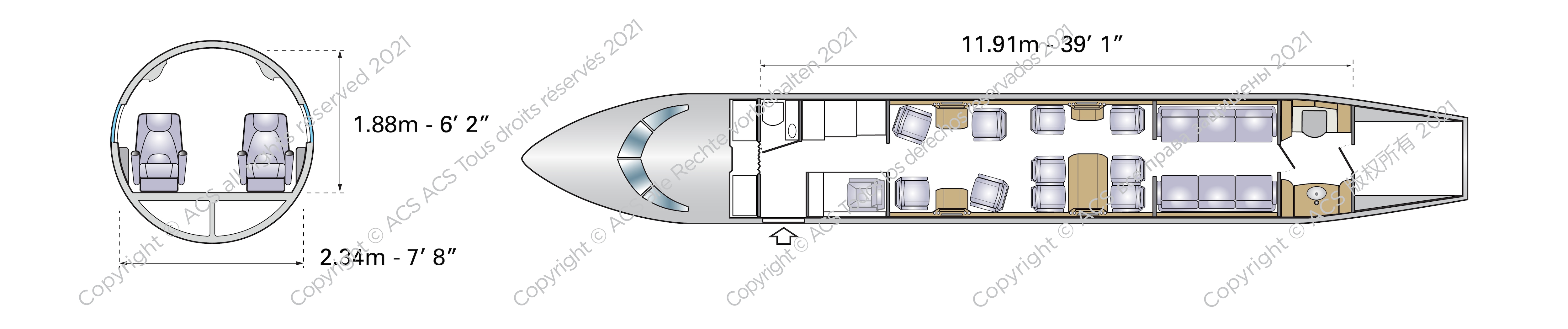 - A small enclosed lavatory at the front of the aircraft ensures complete separation between passengers and crew.