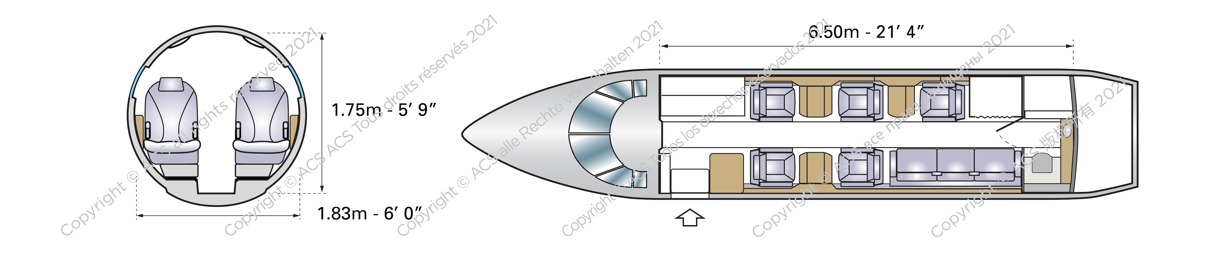 - Fully adjustable seats can swivel 360°and the aircraft provides stand-up headroom along the entire cabin length.